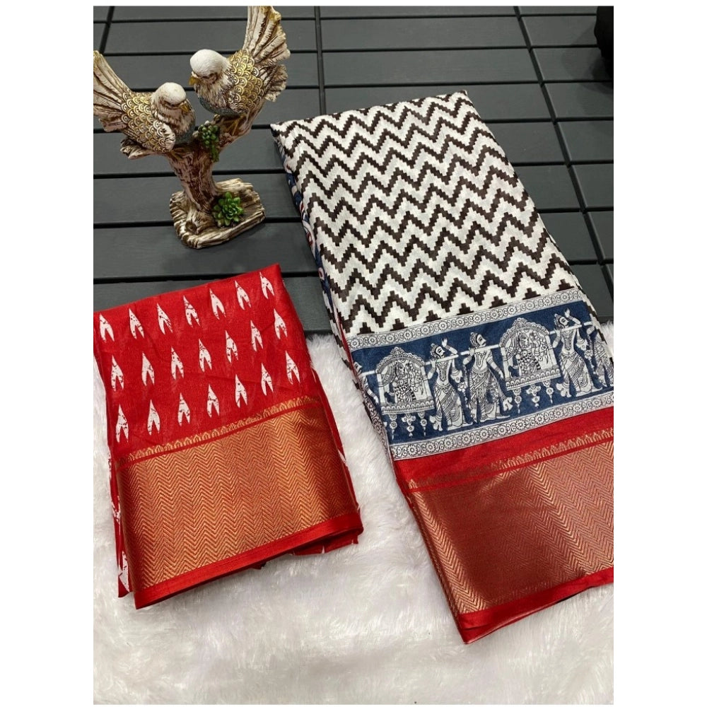 Women's Soft Dola Cotton Kalamkari Printed Saree With Unstitched Blouse 5.5Mtr (Red)