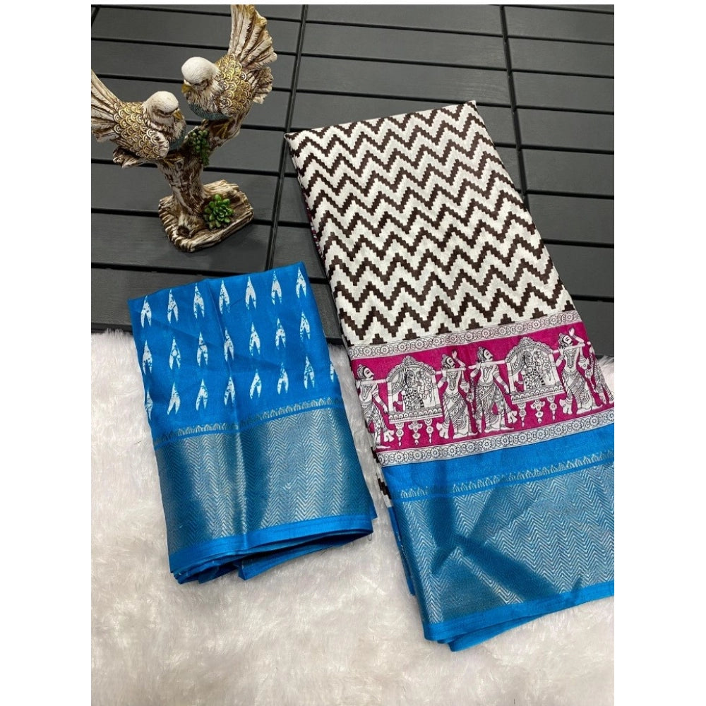 Women's Soft Dola Cotton Kalamkari Printed Saree With Unstitched Blouse Color: Sky Blue, Material: Soft Dola Cotton Pattern: Kalamkari Printed...