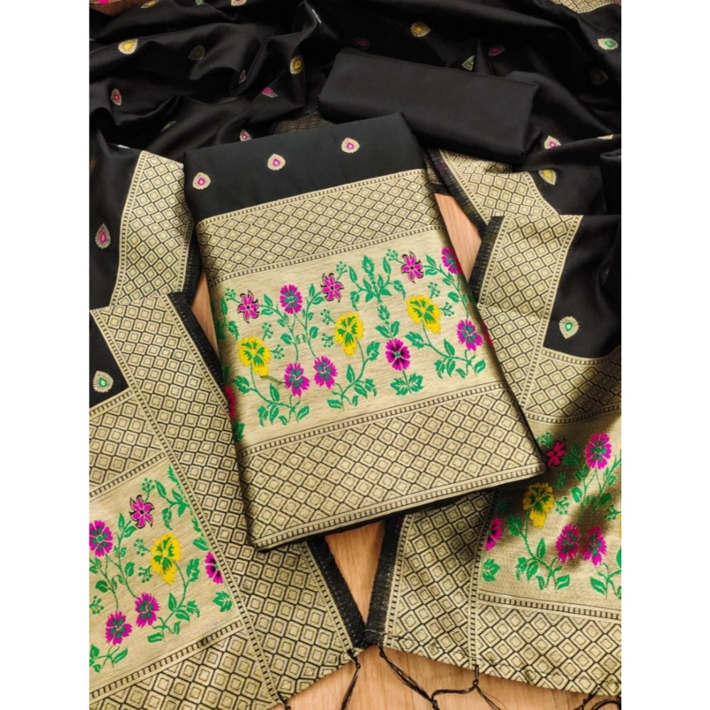 Women's Banarasi Silk Printed Unstitched Salwar Suit Material With Dupatta (Black, 3Mtrs)