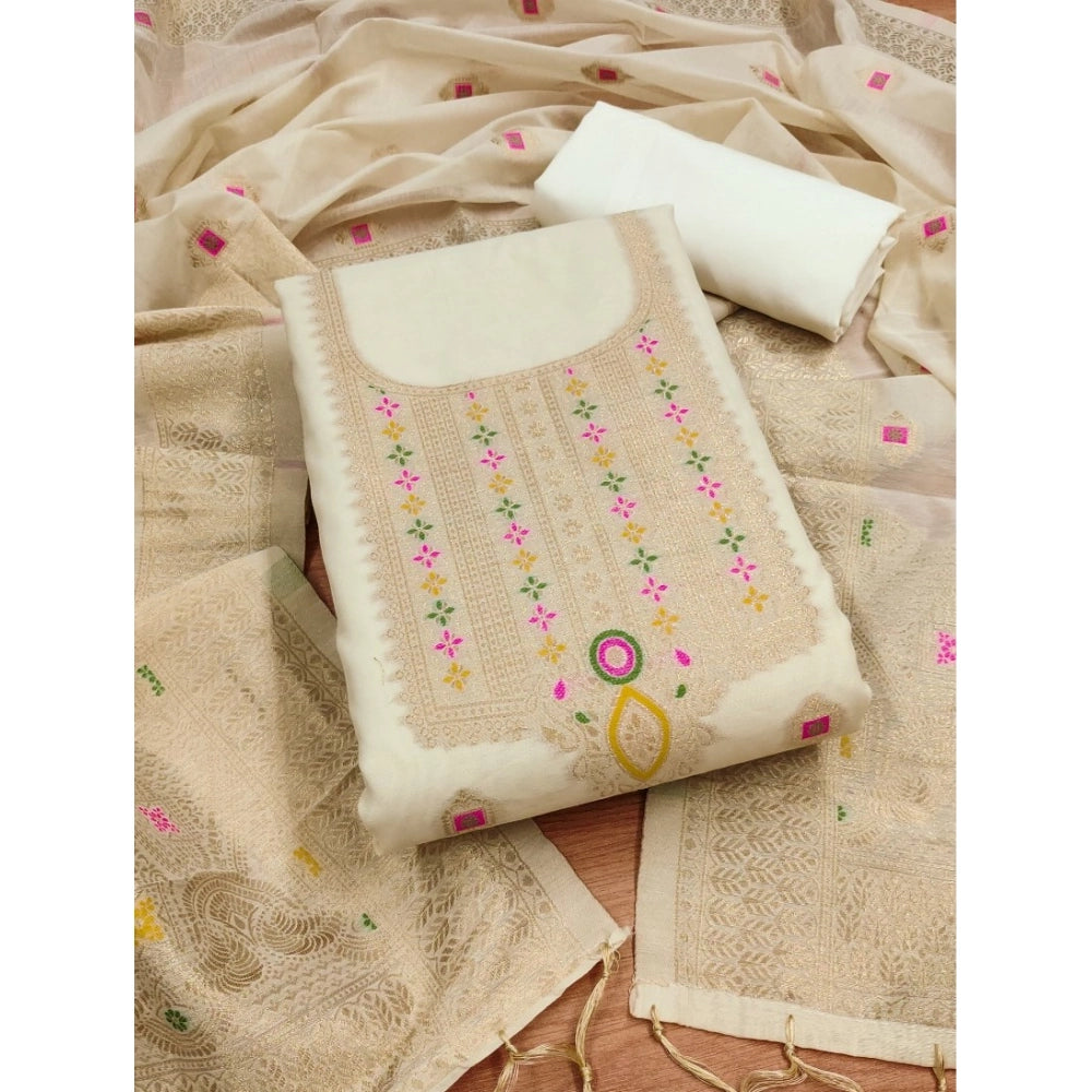 Women's Banarasi Silk Printed Unstitched Salwar Suit Material With Dupatta (White, 3Mtrs)