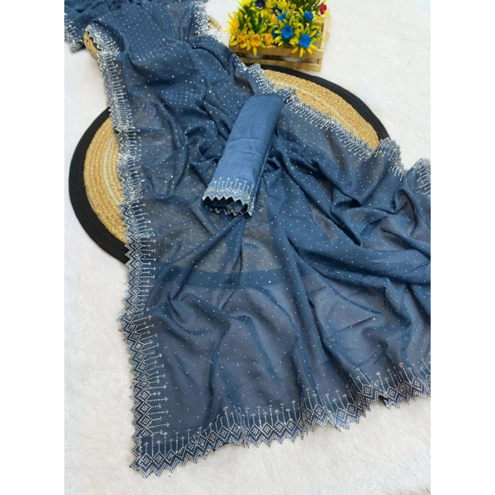 Women's Georgette Stone Work Saree With Unstitched Blouse 5.5Mtr (Grey)