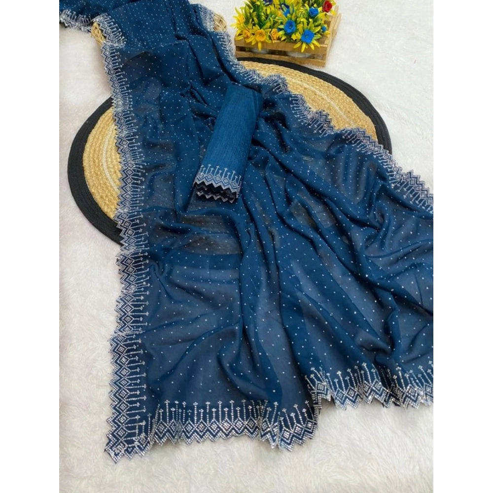Women's Georgette Stone Work Saree With Unstitched Blouse 5.5Mtr