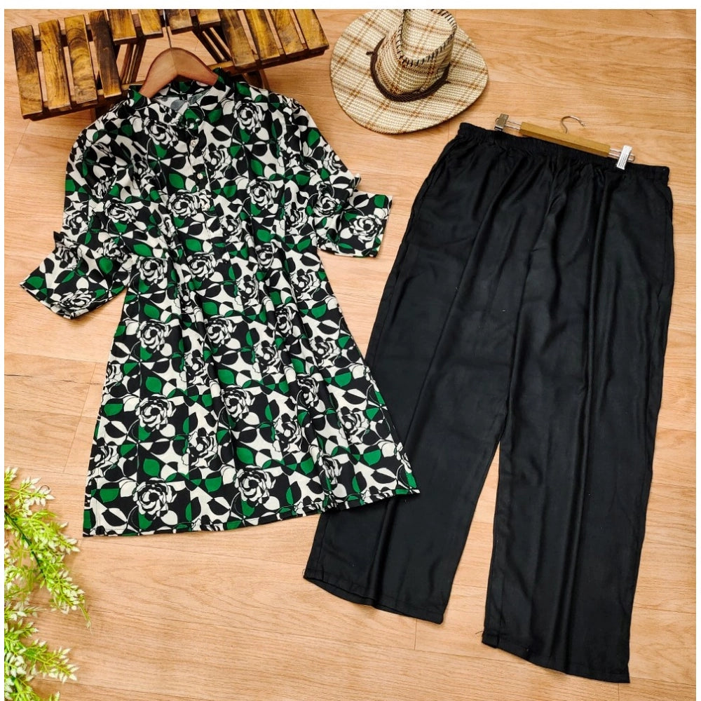 Women's Muslin Printed Mandarin Collar 3-4th Sleeve Kurti With Pant Set (Green)
