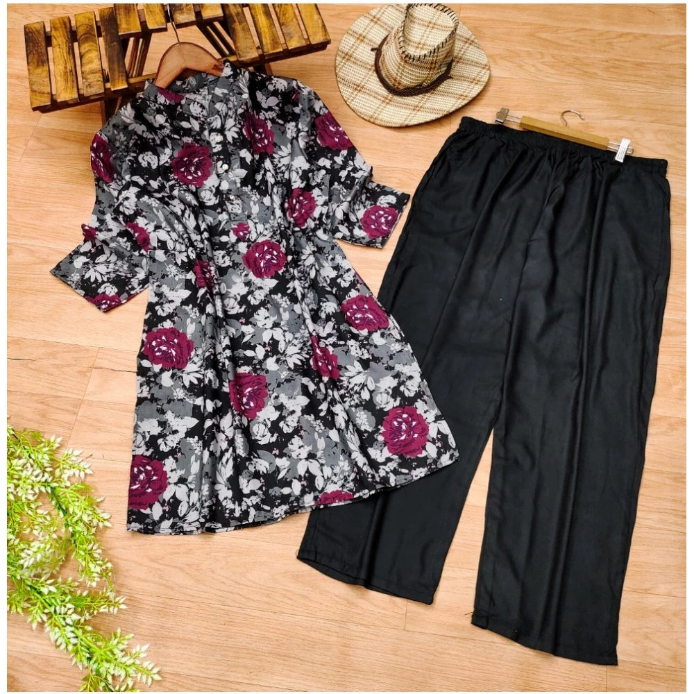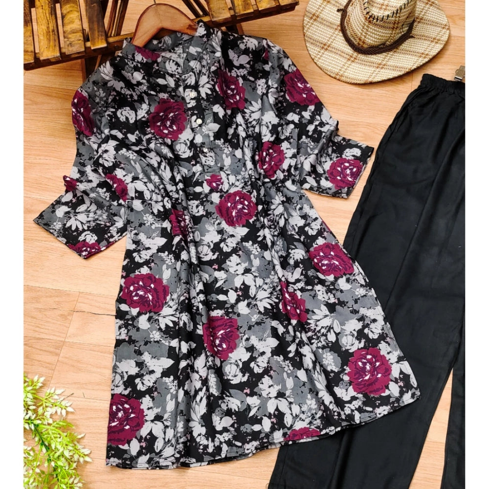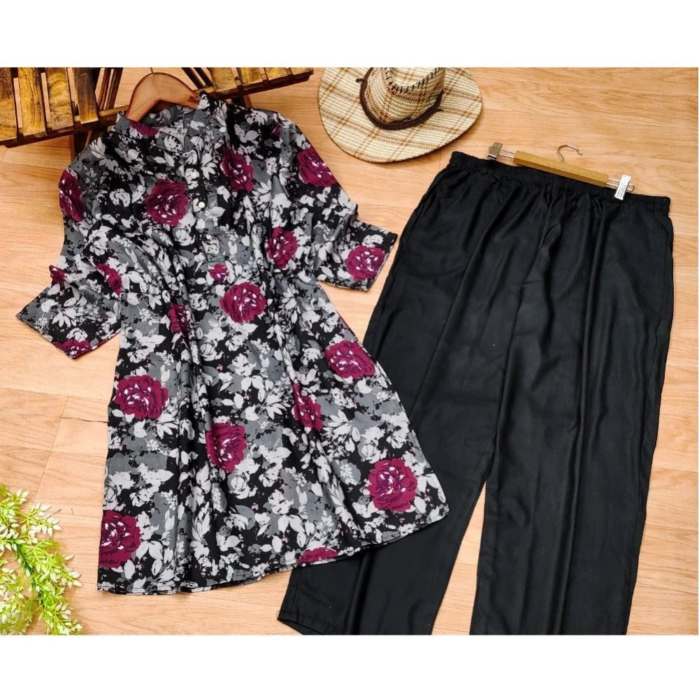 Women's Muslin Printed Mandarin Collar 3-4th Sleeve Kurti With Pant Set (Grey)